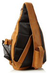 Body bag backpack with side water bottle holder. Large gusseted section on front with another zip pocket. Adjustable shoulder strap.