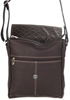 A medium sized messenger bag in a simple style. Features a 3/4 flap with a magnetic snap. This bag also has zippered pockets on the front and on the back. A wide, adjustable shoulder strap is included.