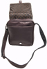 This medium sized messenger bag features a 3/4 flap with a magnetic buckle snap. There is an open pocket under the flap and an open pocket on the back. A wide, adjustable shoulder strap is included.